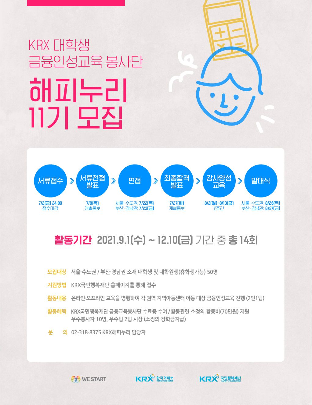 2021년 KRX 대학생 금융인성교육 봉사단 해피누리 11기를 다음과 같이 모집합니다.