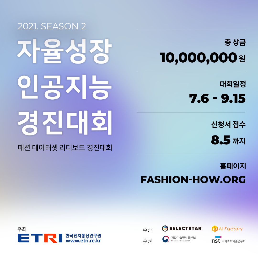 한국전자통신연구원(ETRI)이 주최하고, 셀렉트스타가 주관하는 AI 패션 코디네이터 리더보드 챌린지 <2021 ETRI 자율성장 인공지능 경진대회>가 개최됩니다!