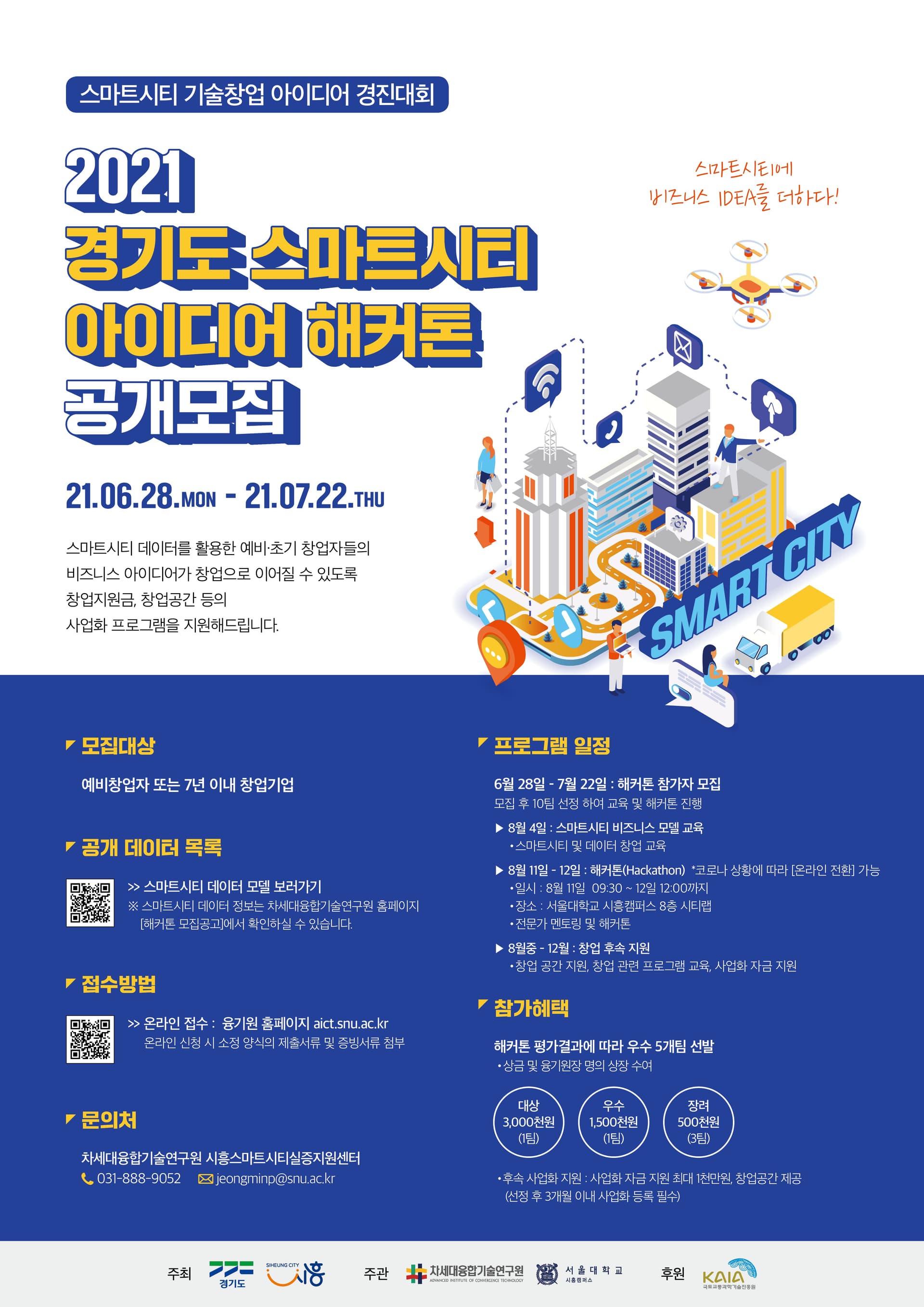 스마트시티 비즈니스 모델을 발굴하기위해 「2021 경기도 스마트시티 아이디어 해커톤(Hackathon)」 경진대회를 개최하고자 합니다.