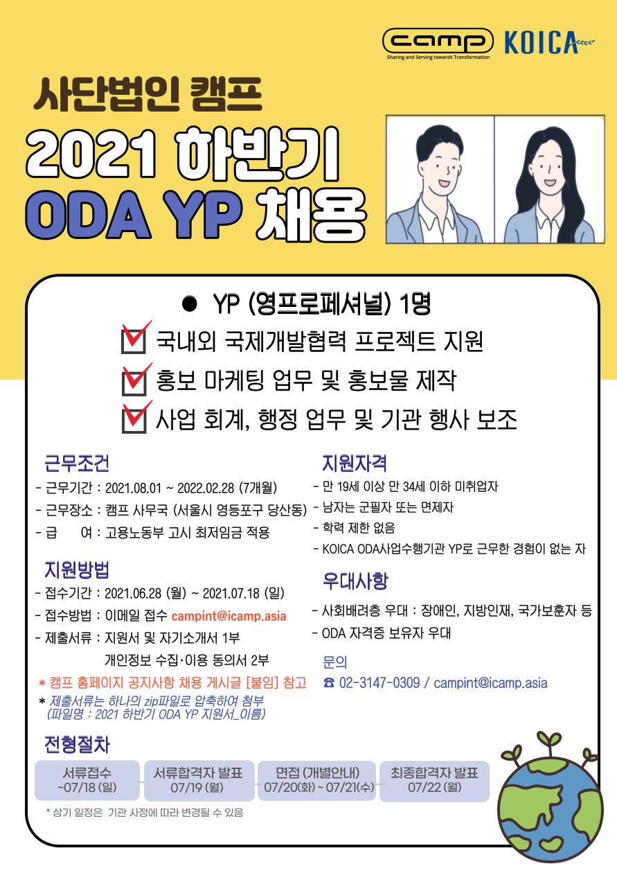 [채용] 사단법인 캠프 2021 하반기 ODA 영프로페셔널 (YP)모집 (~07/18)