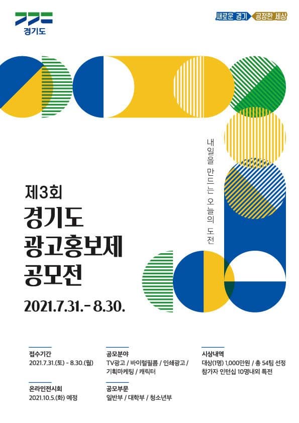 경기도에서는 민간의 참신한 창작콘텐츠를 발굴하여 도정 홍보에 활용하기 위하여 전 국민이 참여하는 「경기도 광고홍보제 공모전」을 개최하오니 많은 참여 바랍니다.