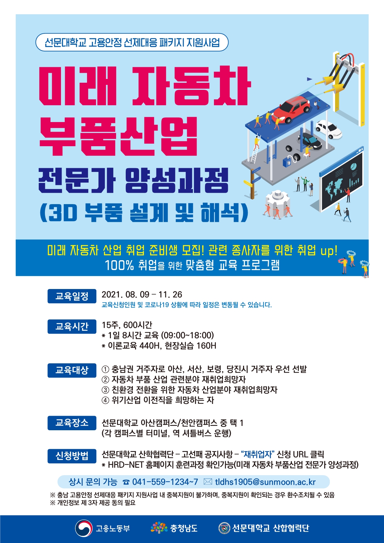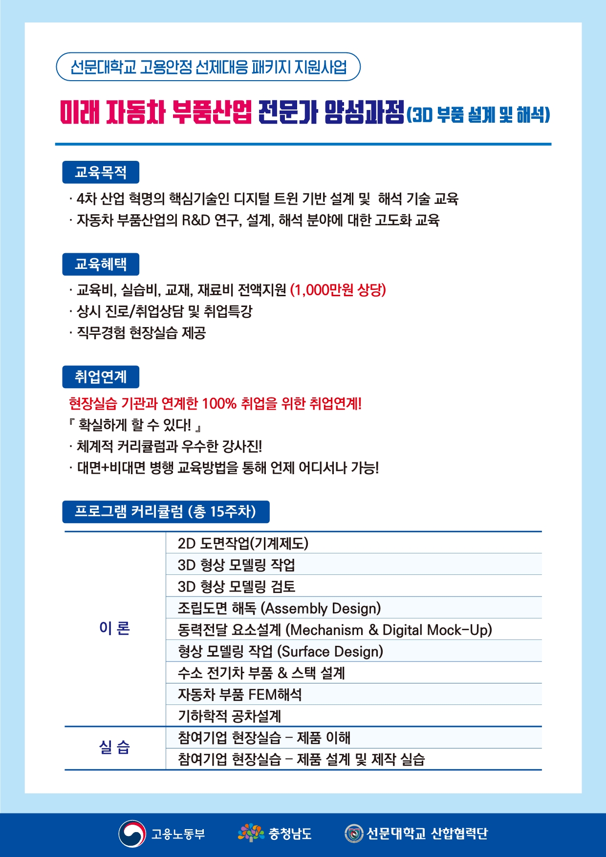 선문대학교 산학협력단 소속 고용안정 선제대응 패키지 지원사업단에서 4차혁명 핵심기술 디지털 트윈기반/3D 부품 설계 및 해석 교육인 ‘미래 자동차 부품산업 전문가 양성과정’ 교육생을 모집합니다.