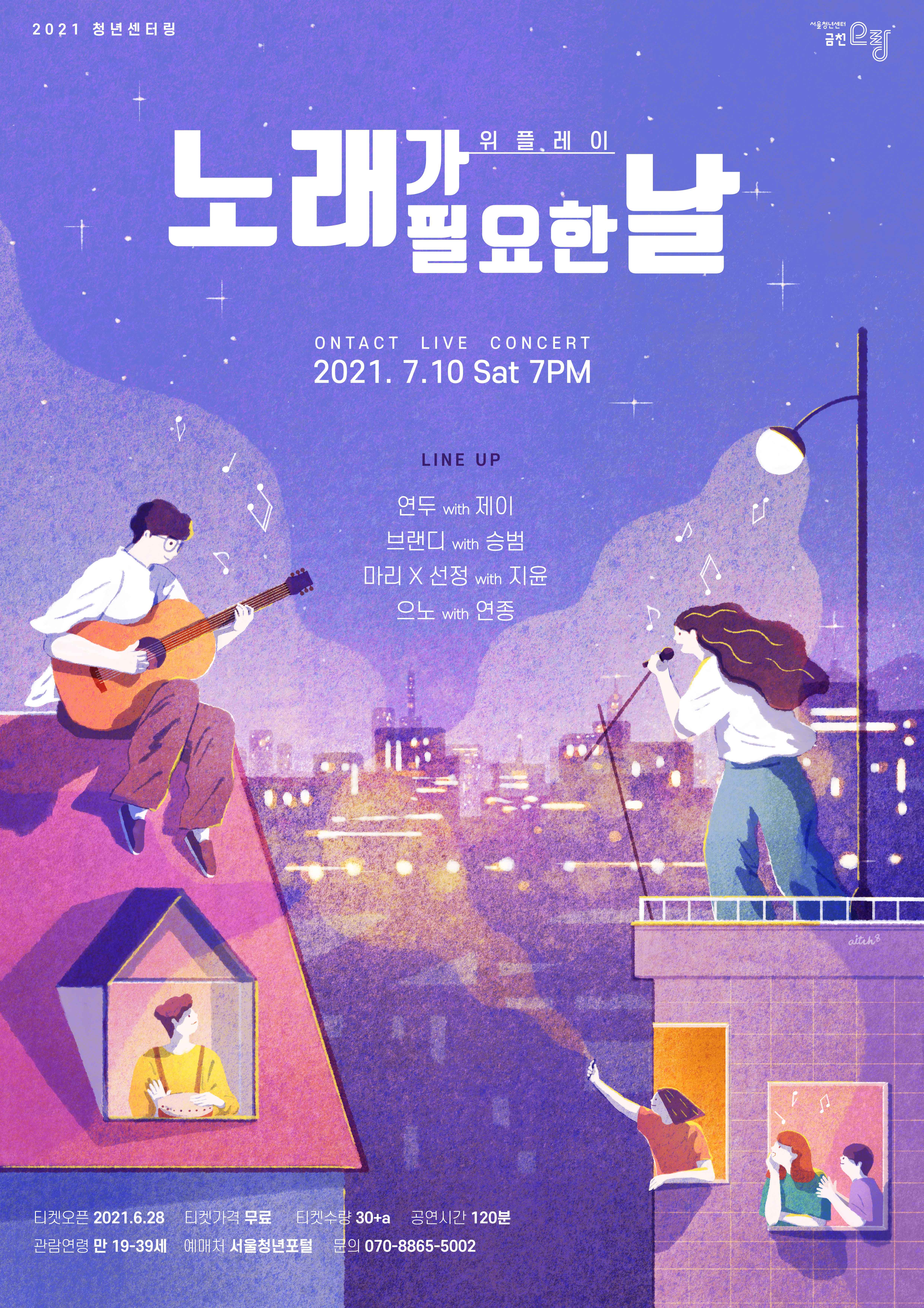<위플레이>는 음악을 사랑하는 청년 뮤지션과 청년이 서로 만나 일상의 순간이 담긴 노래를 만드는 프로젝트입니다. 이 프로젝트를 통해 연결된 뮤지션×청년 4팀은 지난 3개월여의 시간을 함께 모여 자작곡을 지었습니다. "노래가 필요한 날"은 한여름 날, 노래가 필요한 이들을 위한 온택트 라이브 콘서트입니다. 위플레이가 준비한 총 12곡의 플레이리스트로 여러분 곁으로 다가갑니다.