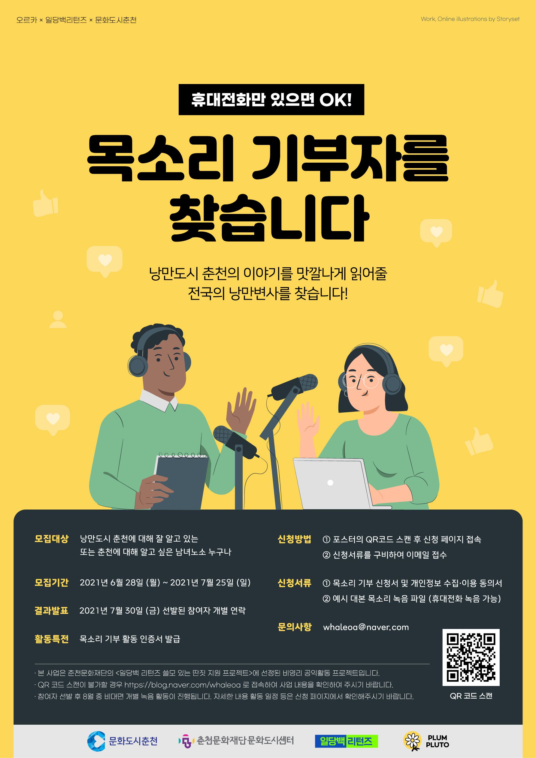 - 본 사업은 춘천문화재단의 ‘2021 춘천 문화도시 조성사업 <일당백 리턴즈> 쓸모 있는 딴짓 지원 프로젝트’에 선정된 비영리 공익활동 프로젝트입니다.