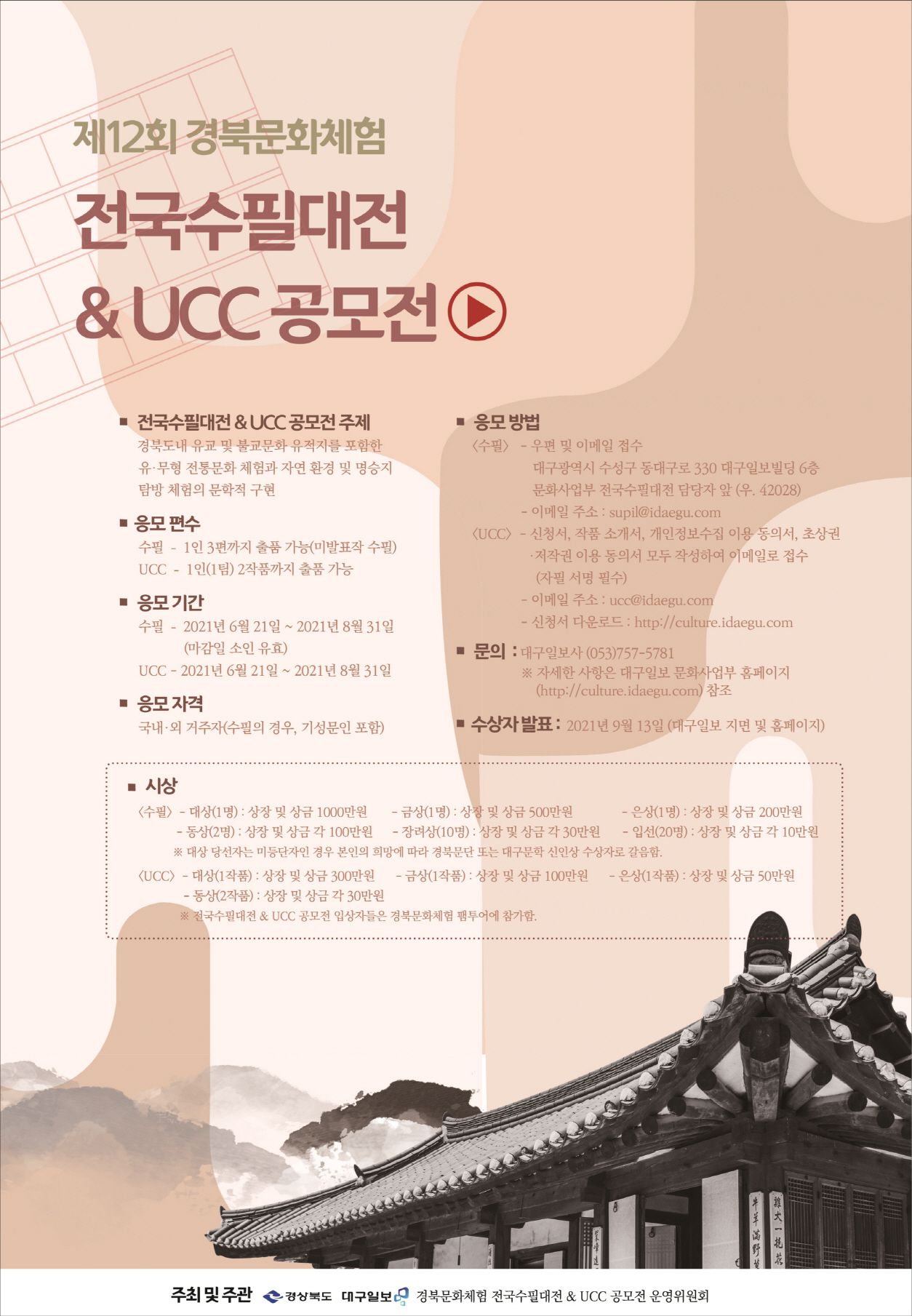 대구일보는 한국 유교문화 및 불교문화의 본거지인 경북의 관광산업 진흥을 위해 초중고생, 대학생, 일반인 등 전 국민을 대상으로 ‘제12회 경북문화체험 전국수필대전 & UCC 공모전’을 개최합니다.