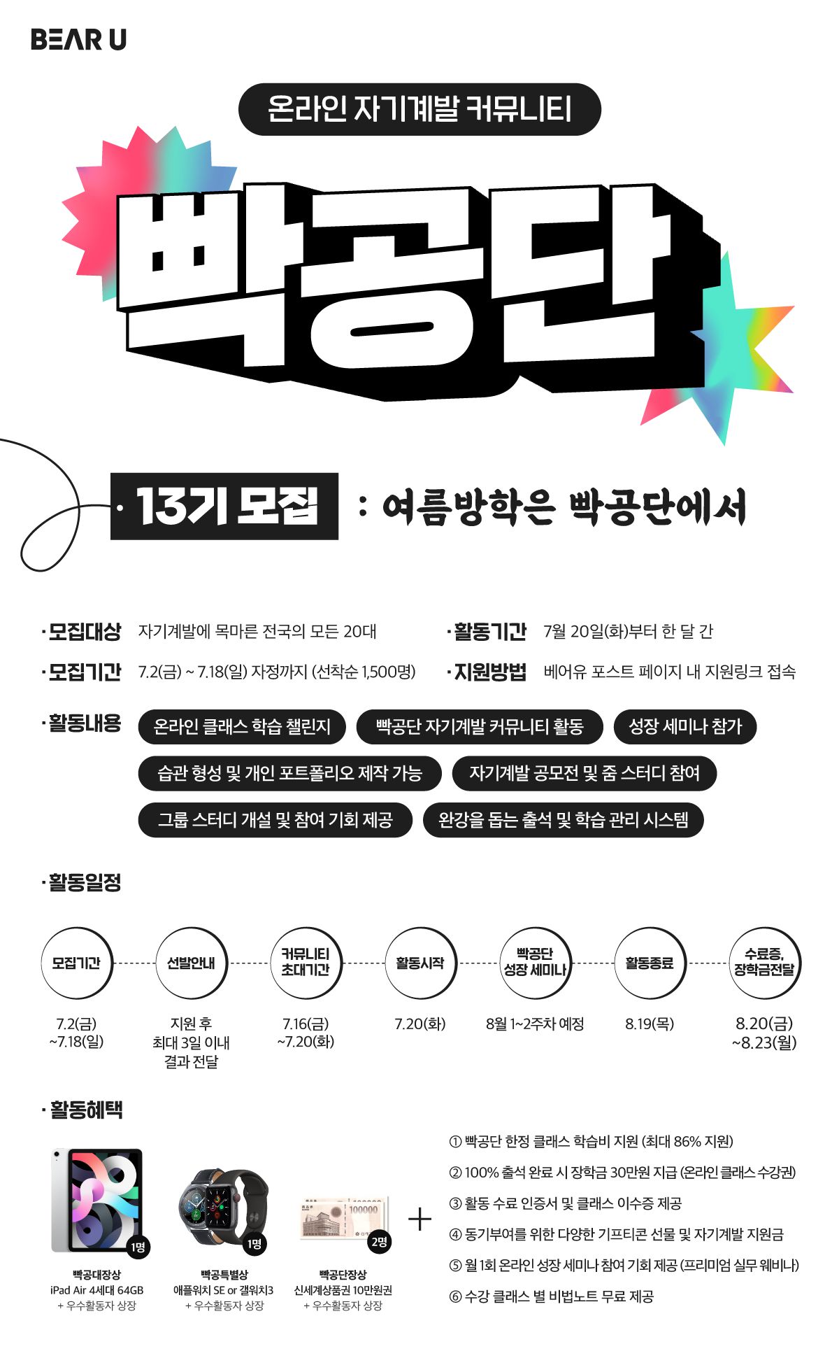 여름방학 기간동안 하루10분, 딱 한 달 간! 평소 배우고 싶었던 분야의 온라인 클래스(취업역량, 직무스킬, 투잡, 재테크, 취미 카테고리 등 50여개 중 선택)를 수강하며 서로의 성장을 공유하는 온라인 자기계발 커뮤니티입니다. 나의 성장을 친구들과 공유하면서 한 달 간 변화를 느껴보세요. 혼자였다면 포기했을 30일 간의 여정을 빡공이들과 학습 매니저가 여러분의 곁에서 응원하겠습니다!