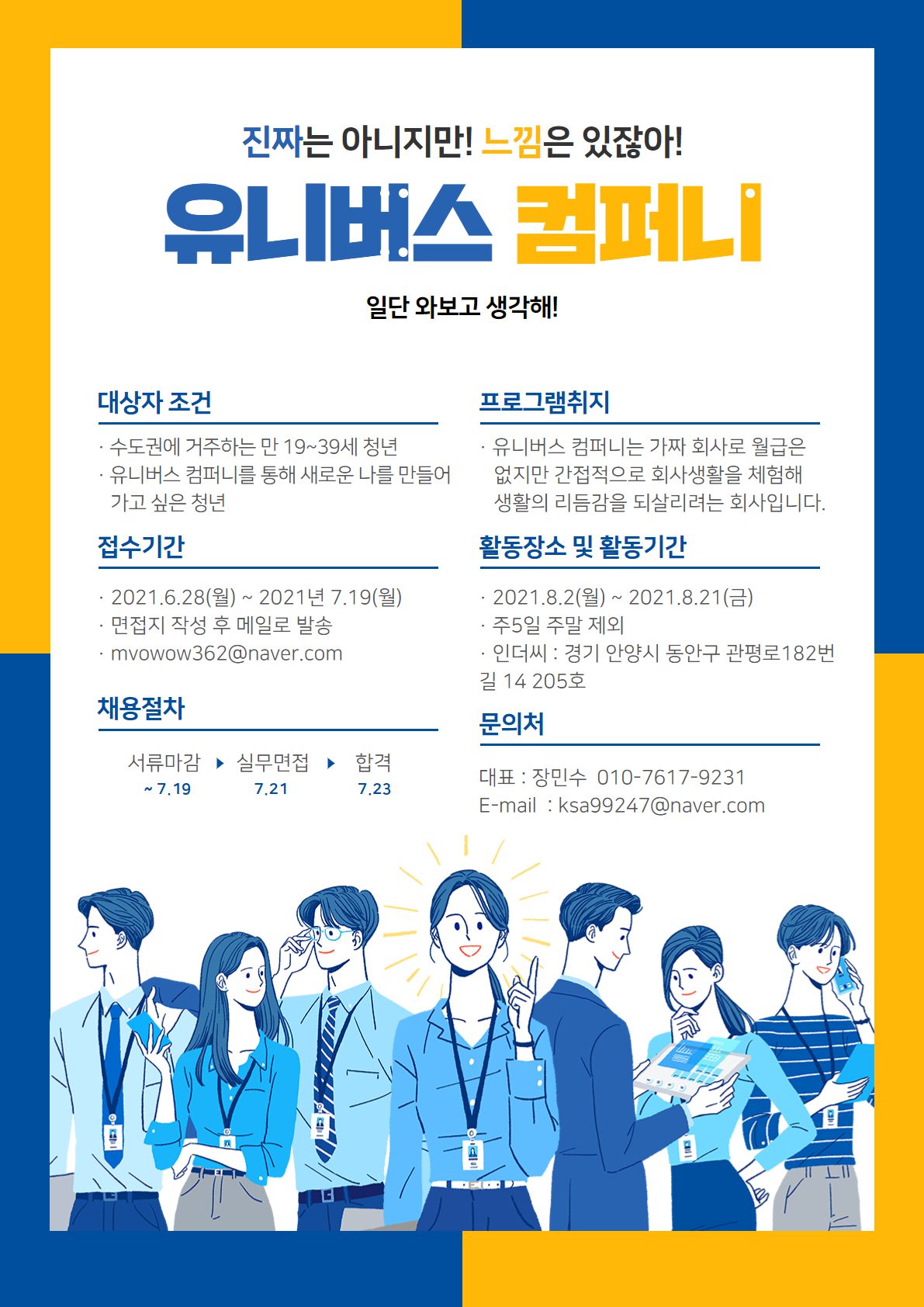 3주간 가상회사 생활을 할 청년을 모집합니다. 매일 출근하며 규칙적인 생활습관을 만들며, 상상만 해도 행복한 가상회사를 다녀보아요~! 서로를 존중하는 워라벨이 가득한 유토피아 같은 ‘ 유니버스 컴퍼니 ’ 지금 바로 지원하세요!