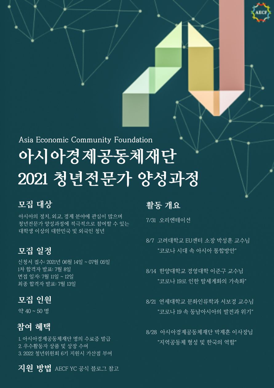 AECF Youth Expert Program is an annual conference program conducted to provide opportunities to undergraduate and graduate students for learning and discussing topics related to Asian integration. The main theme of this year’s conference is “COVID-19 and the New Direction for Asian Integration”. The primary scope is to provide a forum for discussion on political and economic issues in Asia, along with insight on future directions of Asian regional cooperation. Do not miss this opportunity to listen to professionals’ lectures online and engage with other youths interested in Asia’s diplomacy, politics and economy! 🎉🤗