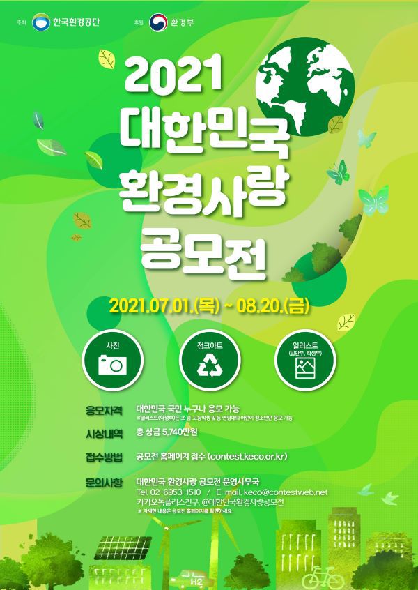 대한민국의 환경복지를 실현하는 한국환경공단이 “2021 대한민국 환경사랑공모전”을 개최합니다. 환경을 사랑하는 여러분의 아름다운 도전을 기다립니다.