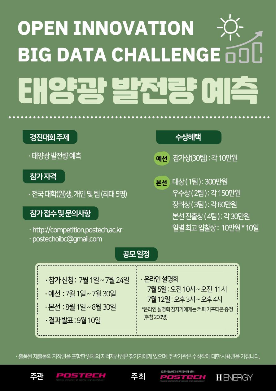 POSTECH 오픈이노베이션 빅데이터 센터(OIBC)와 기술로 전력 시장을 개방하는 기업 H Energy가 함께 미래 전력 시장을 이끌어갈 인재를 발굴・지원하기 위해 대학 및 대학원생을 대상으로 제3회 POSTECH OIBC CHALLENGE를 주최합니다. 대학(원)생들의 많은 관심과 참여 부탁드립니다.