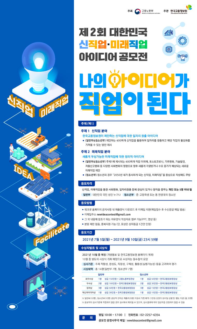 새롭게 생겨날 직업에 대한 아이디어를 공모합니다. 2021년 2회차를 맞이하는 대한민국 신직업·미래직업 아이디어 공모전이 이번 7월 5일부터 9월 10일까지 진행됩니다.