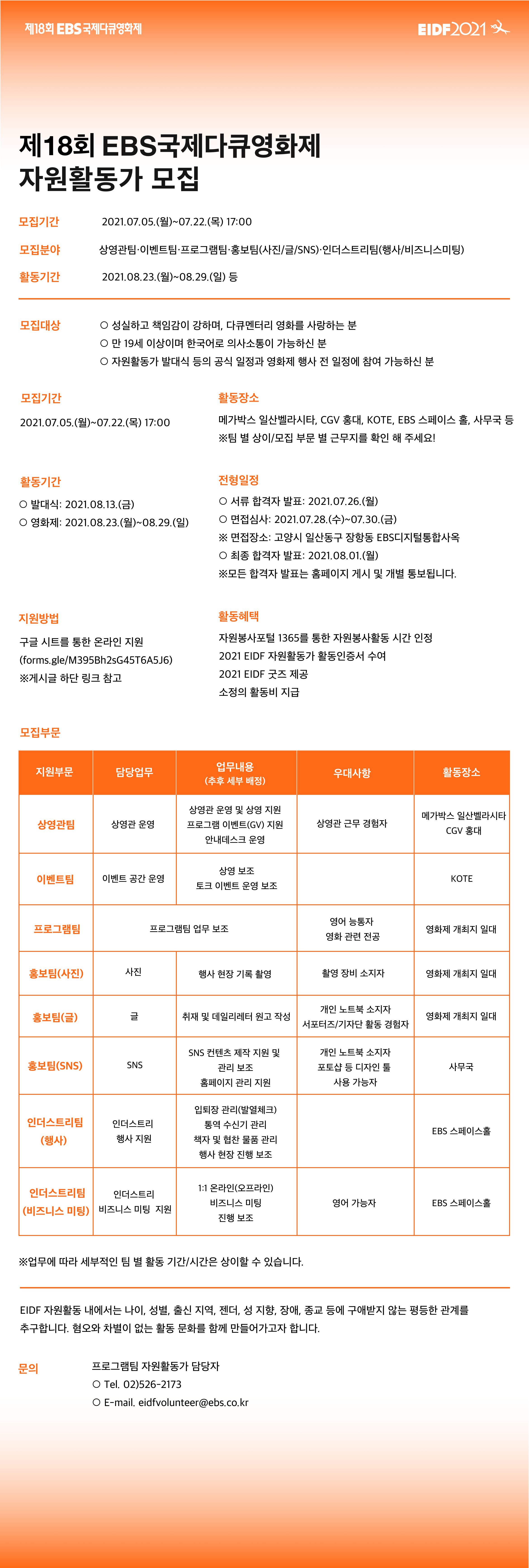 프로그램팀 자원활동가 담당자 02-526-2173 / eidfvolunteer@ebs.co.kr