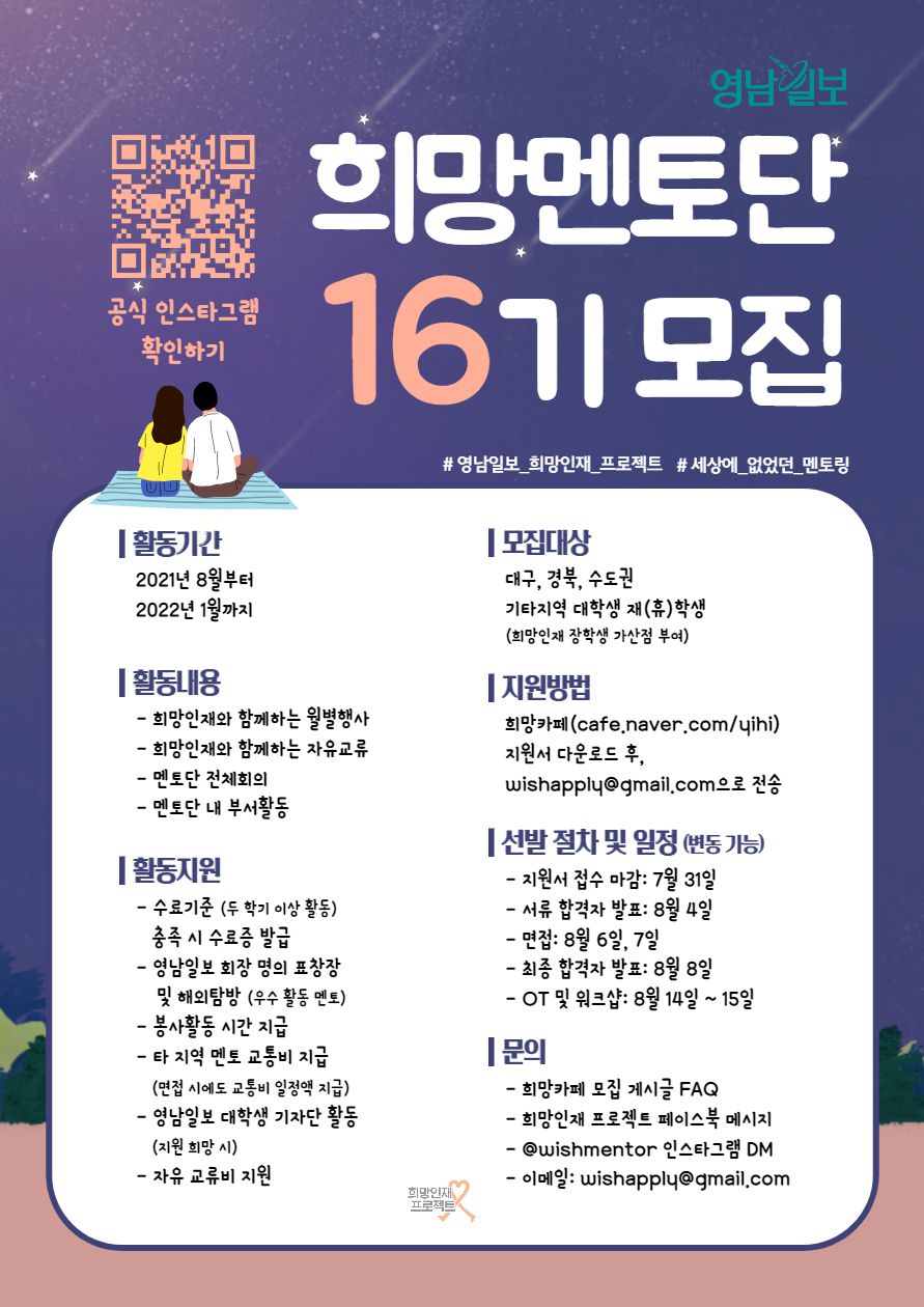 대구 경북을 대표하는 대학생 대외활동 '영남일보 희망멘토단'이 16기 신규 희망멘토를모집합니다.