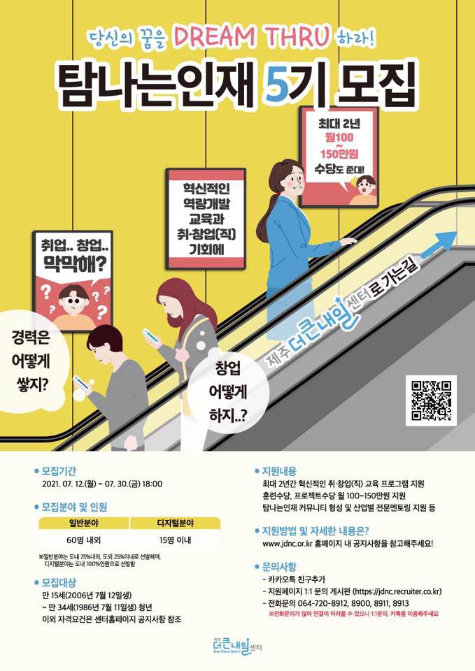[제주더큰내일센터] 취창업 청년을 위해 월100~150만원 지원, 탐나는인재 5기 모집(~7/30, 금) / SW 개발자 육성을 위한 디지털분야 신설!