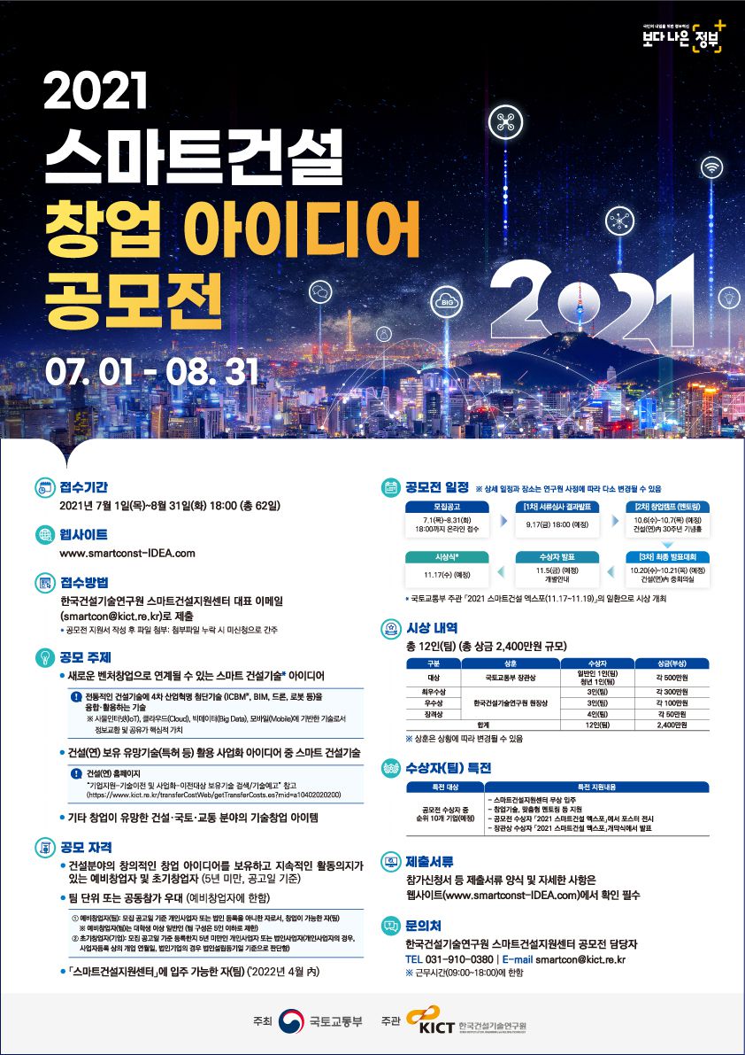 스마트건설지원센터에서는 4차 산업혁명 기반의 첨단기술을 활용하는 스마트건설사업 아이디어를 발굴하여, 벤처창업에 관심이 있는 예비창업자 및 신규사업 확장을 위한 초기 창업기업들에게 전주기적 창업지원을 제공하고자 아래와 같이『2021 스마트건설 창업 아이디어 공모전』을 실시하오니 많은 관심과 참여 부탁드립니다.