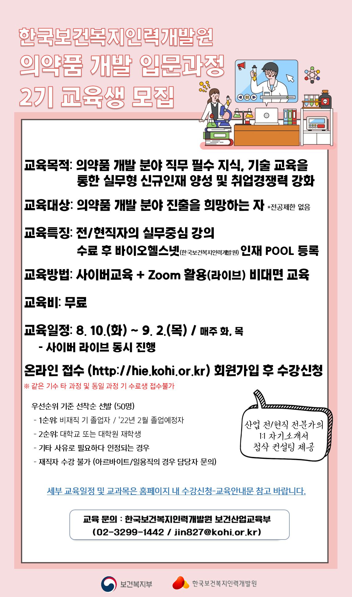한국보건복지인력개발원에서 제약바이오산업 개발 분야 취업준비생들을 위한 직무 교육과정 교육생을 모집합니다!