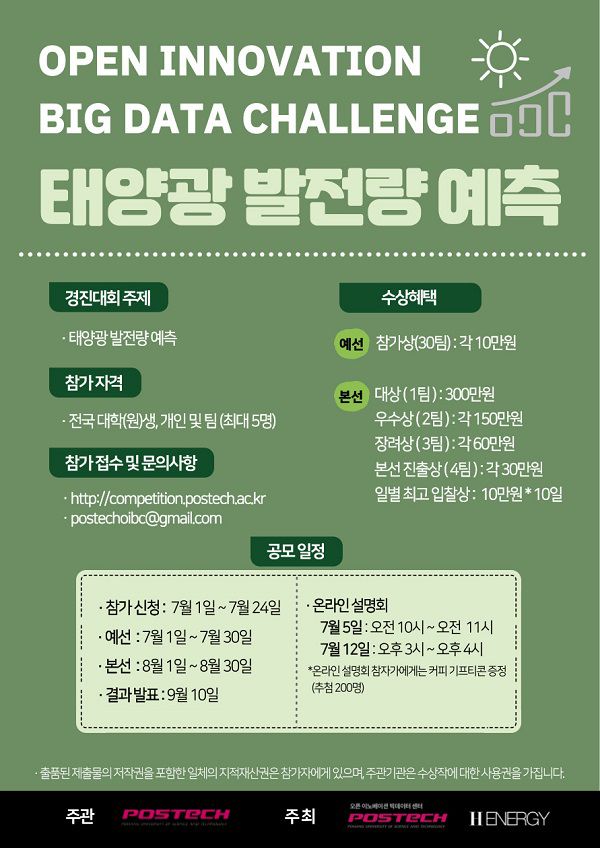 대상으로 제3회 POSTECH OIBC CHALLENGE를 주최합니다. 대학(원)생들의 많은 관심과 참여 부탁드립니다.
