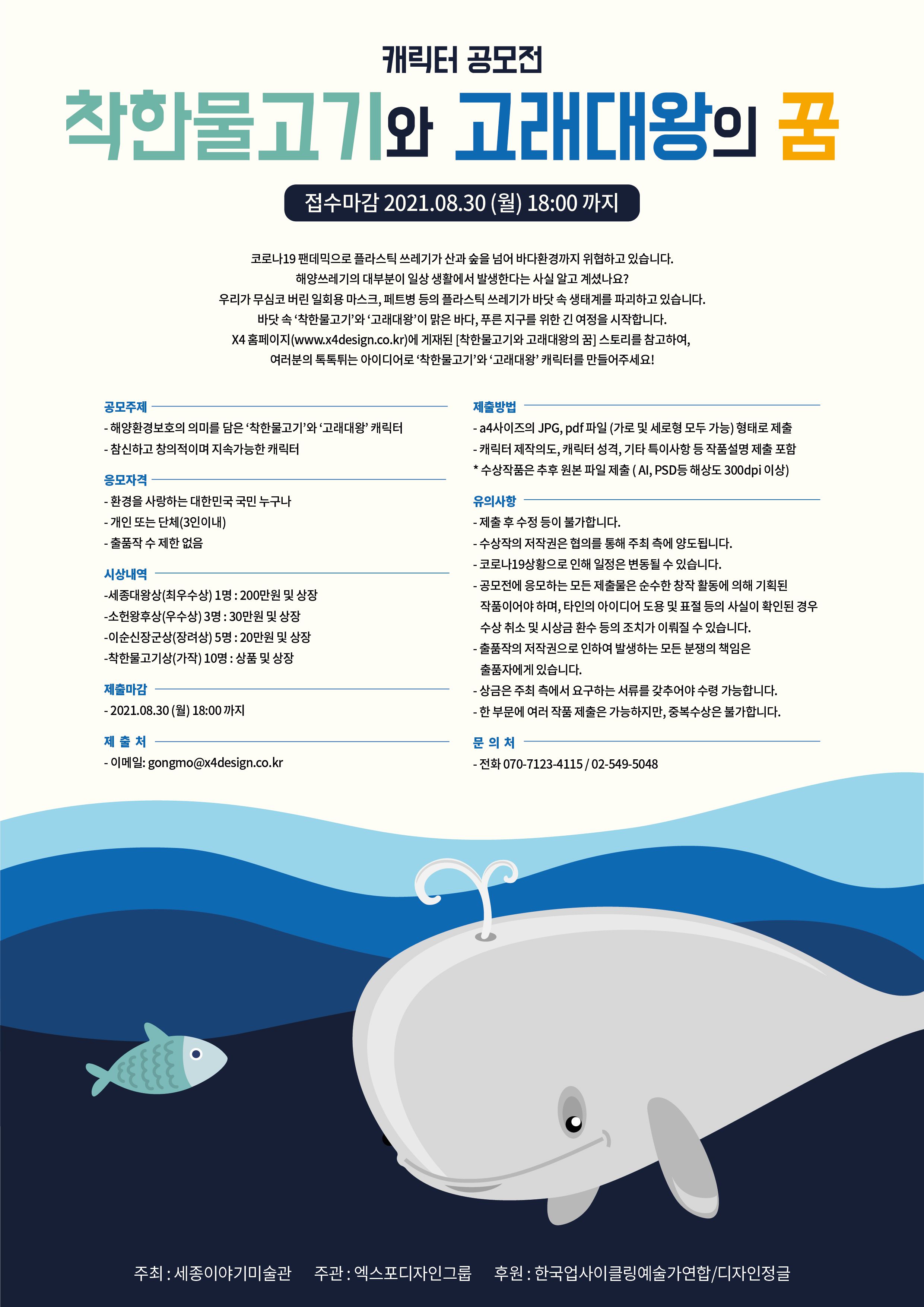 X4 홈페이지(http://www.x4design.co.kr)에 게재된 [착한물고기와 고래대왕의 꿈] 스토리를 참고하여, 여러분의 톡톡튀는 아이디어로 ‘착한물고기’와 ‘고래대왕’ 캐릭터를 만들어주세요!