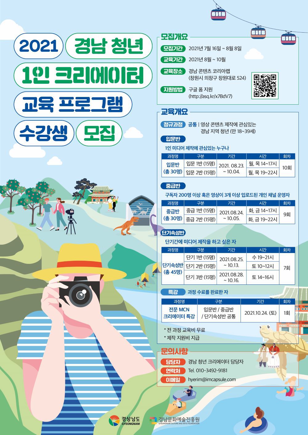 • 기획의도 : 경남 청년을 대상으로 1인 미디어 콘텐츠 제작 교육을 통해 취창업을 장려하고, 지역자원을 소재로 지역과 공동체 기반의 미디어 콘텐츠 제작자 양성코자 함