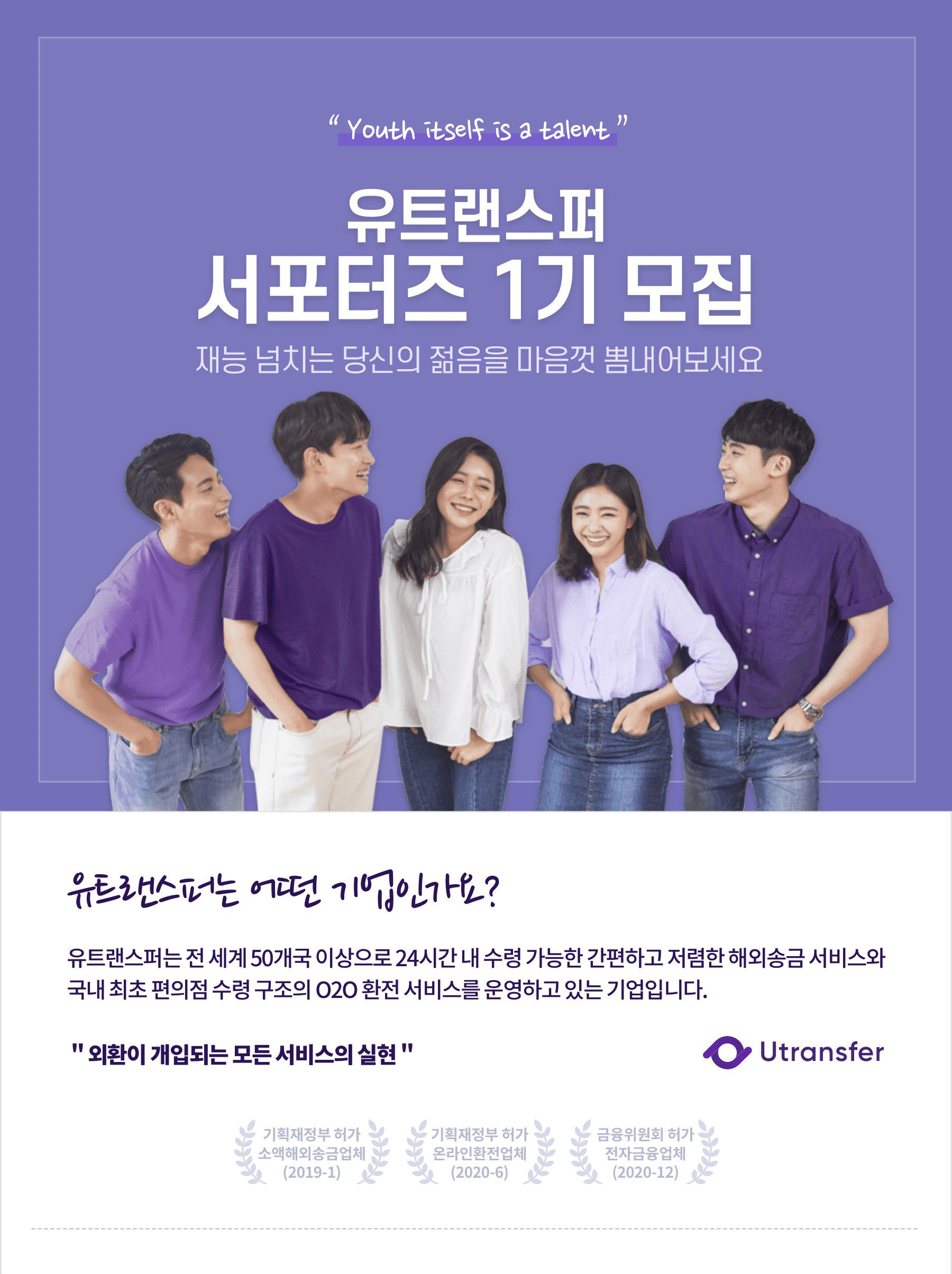 【유트랜스퍼 서포터즈 】외환 전문 핀테크 기업 유트랜스퍼와 함께 마케팅 실무를 체험할 수 있는 기회를 잡으세요!
