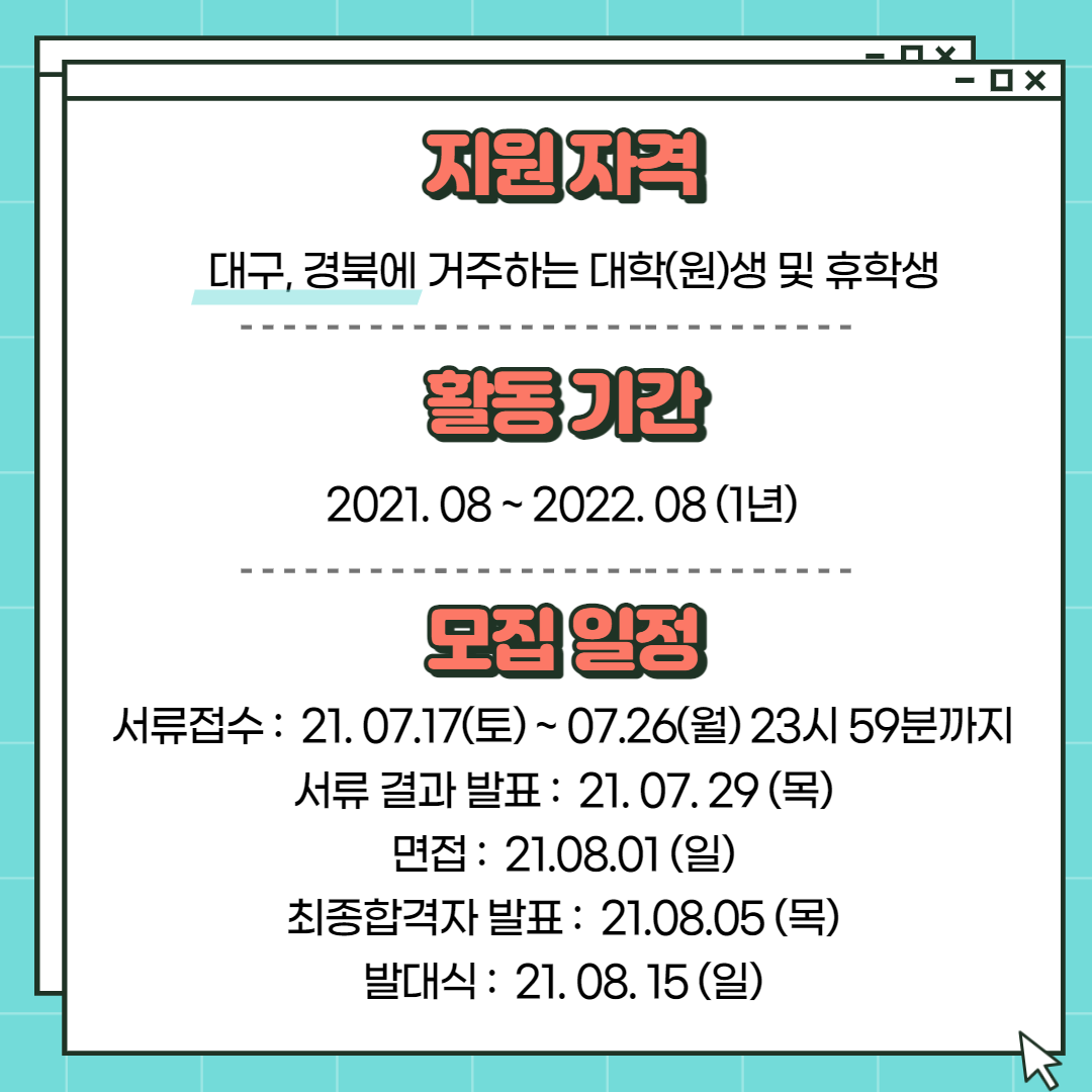 대구 경북 거주 중인 대학(원) 재/ 휴학생이라면 누구나 지원 가능