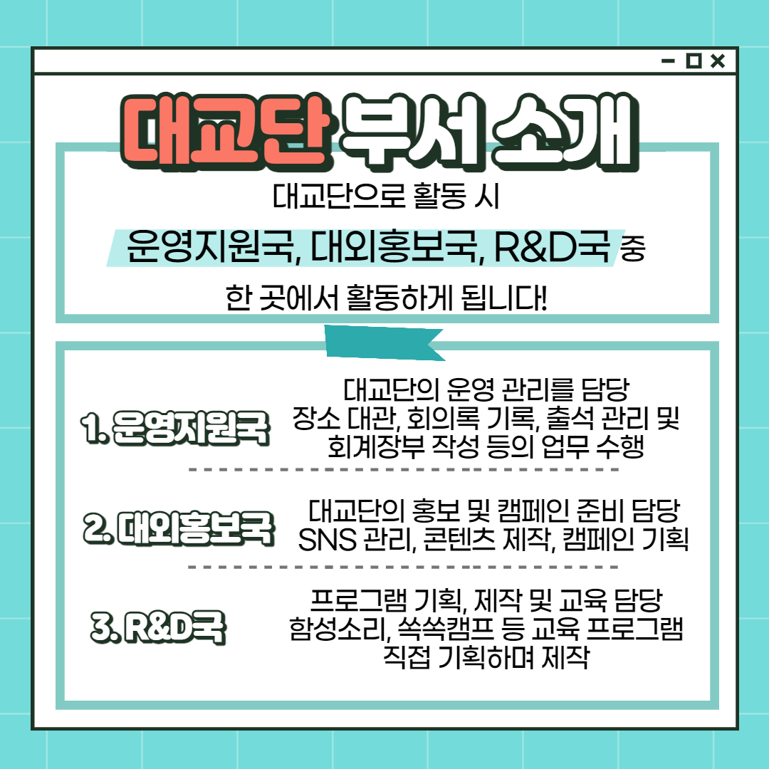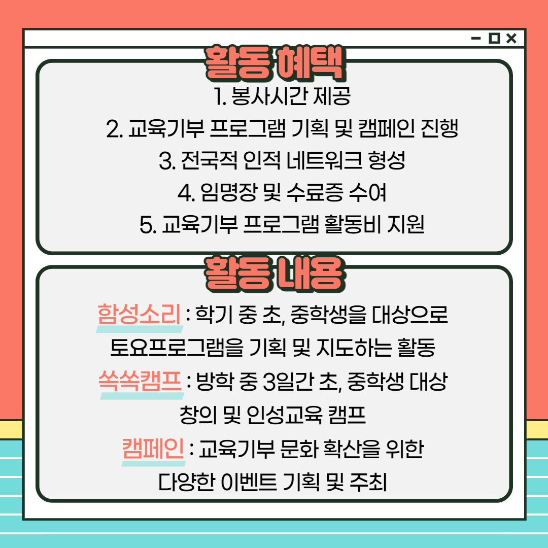 여러분들의 끼와 재능을 발휘해 스스로 교육봉사를 기획해본 적 있나요? 바로 이곳! 대교단에서 꿈을 펼칠 수 있습니다🌈