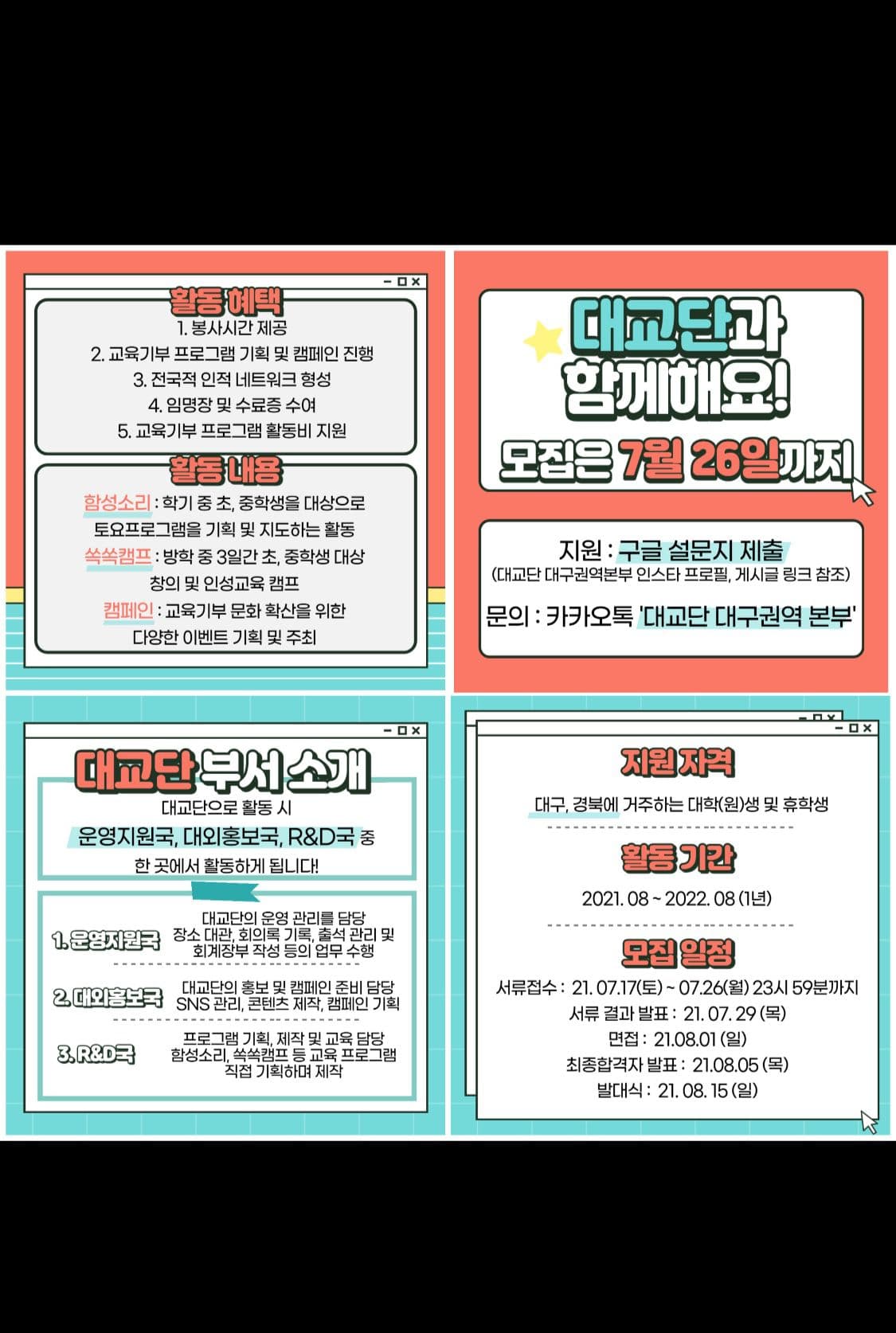 문의사항 : 카카오톡 '대교단 대구권역본부', 인스타그램 '대교단 대구권역본부'로 DM 부탁드립니다!