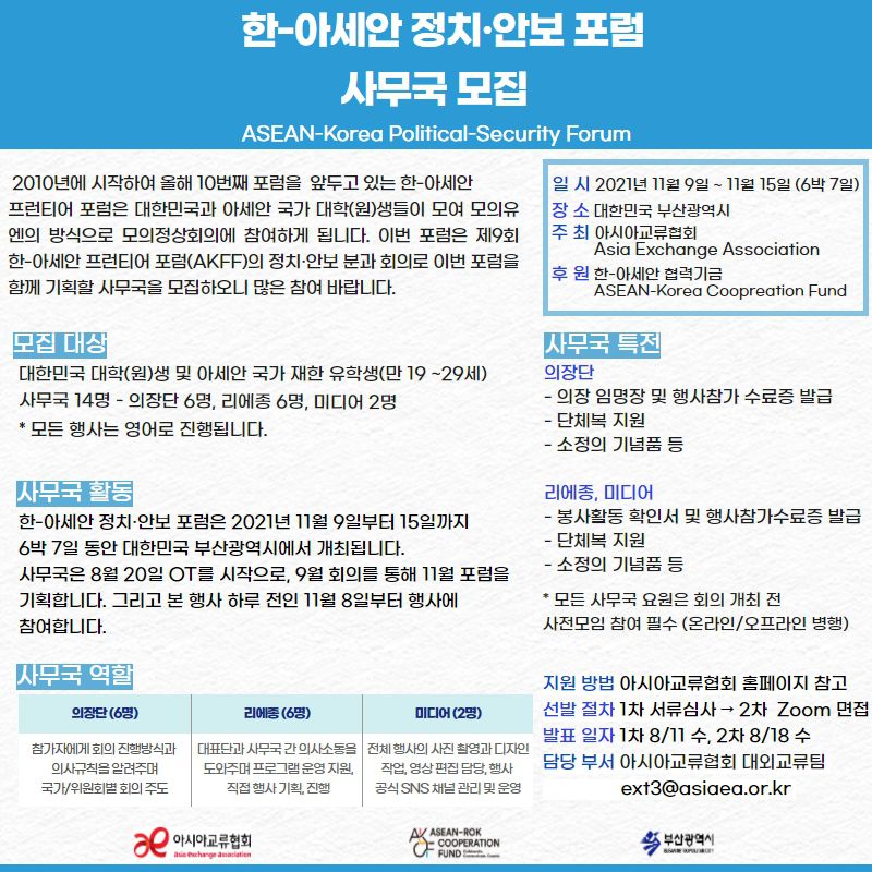 한-아세안 프런티어 포럼은 대한민국과 아세안 국가 대학(원)생들이 모여 모의유엔의 방식으로 모의정상회의에 참여하게 됩니다. 이번 포럼은 제9회 한-아세안 프런티어 포럼(AKFF)의 분과 회의로 정치·안보에 집중하여 진행됩니다.