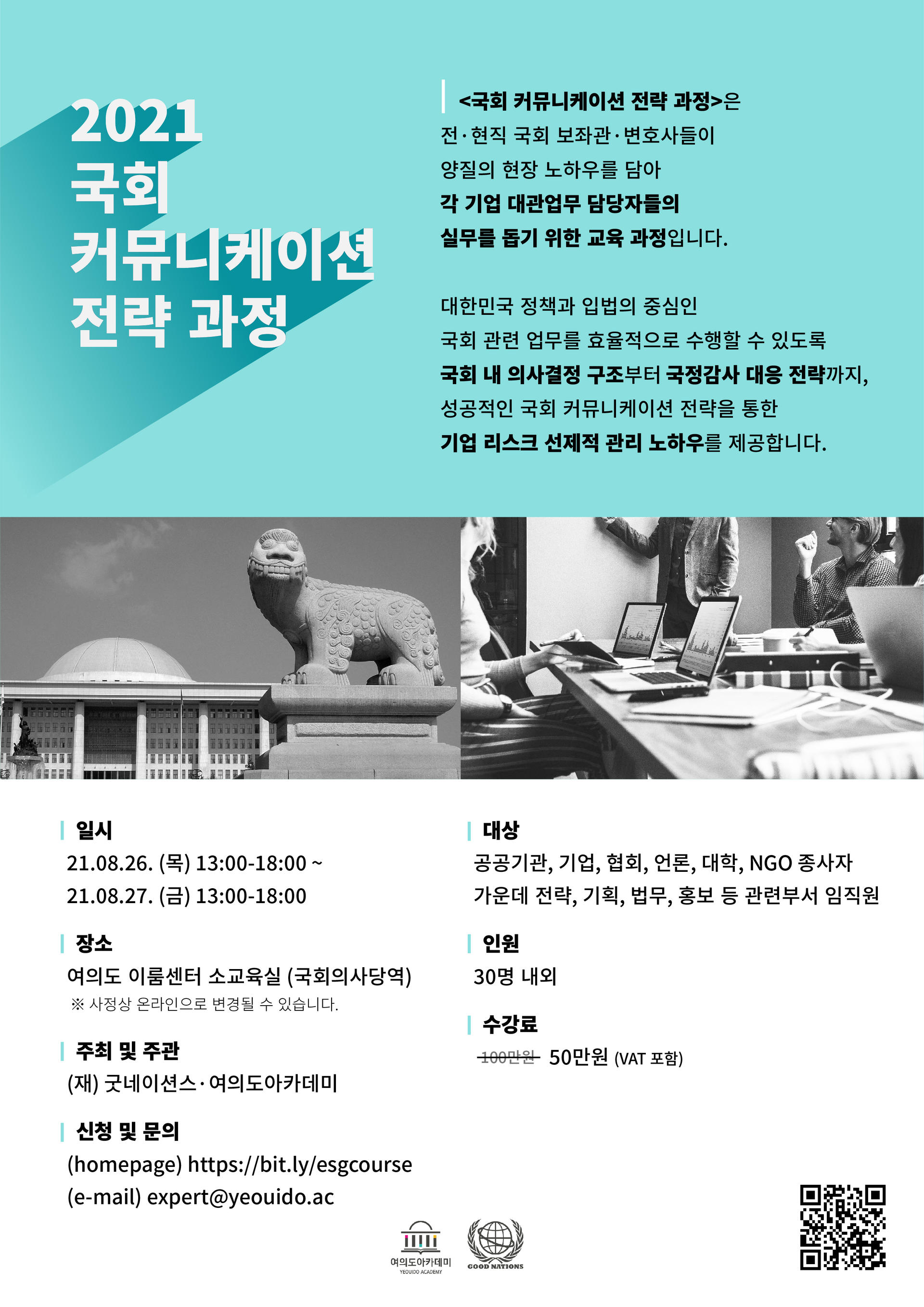 - 법률 제·개정, 예산 심의, 행정부 견제 등 국회에서 이루어지는 의정 활동의 구동 원리를 이해하고, 이를 바탕으로 공공·기업·언론·대학·문화·시민사회 등 다양한 분야에서의 리스크 대응 및 소통 역량을 강화하기 위함