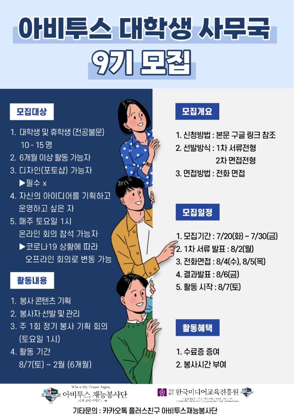 - 혜택 : 봉사시간, 외부협력 경험, 자료 관리 능력 향상, 타 학교 학생과의 교류, 전공 관련 봉사 기획 가능, 한국미디어교육진흥원상 우수 활동자상 수상 가능
