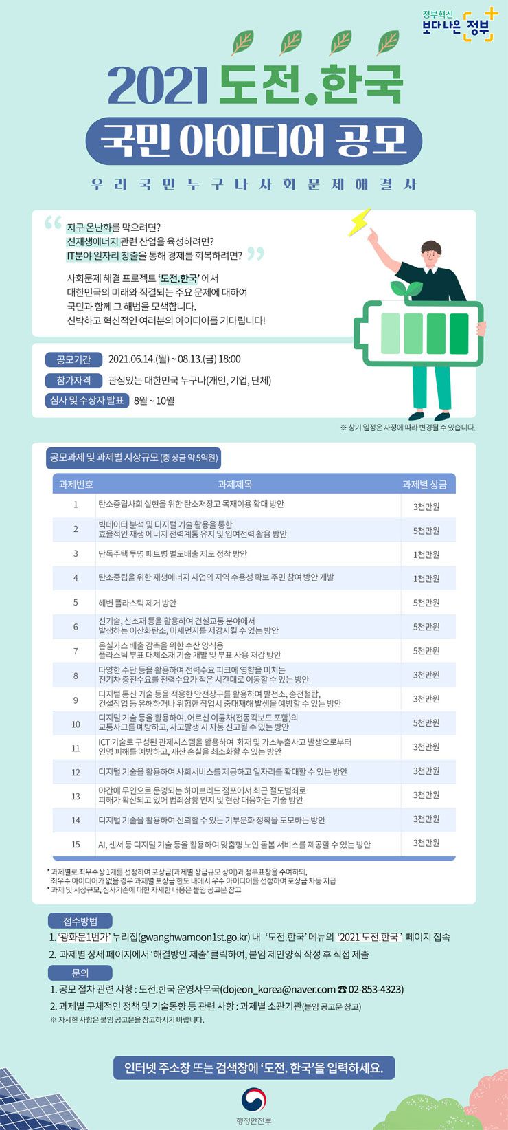 - 사회문제 해결 프로젝트로서 대한민국의 미래와 직결되는 총 15개 사회문제에 대해 국민과 함께 해결방안 공모전.