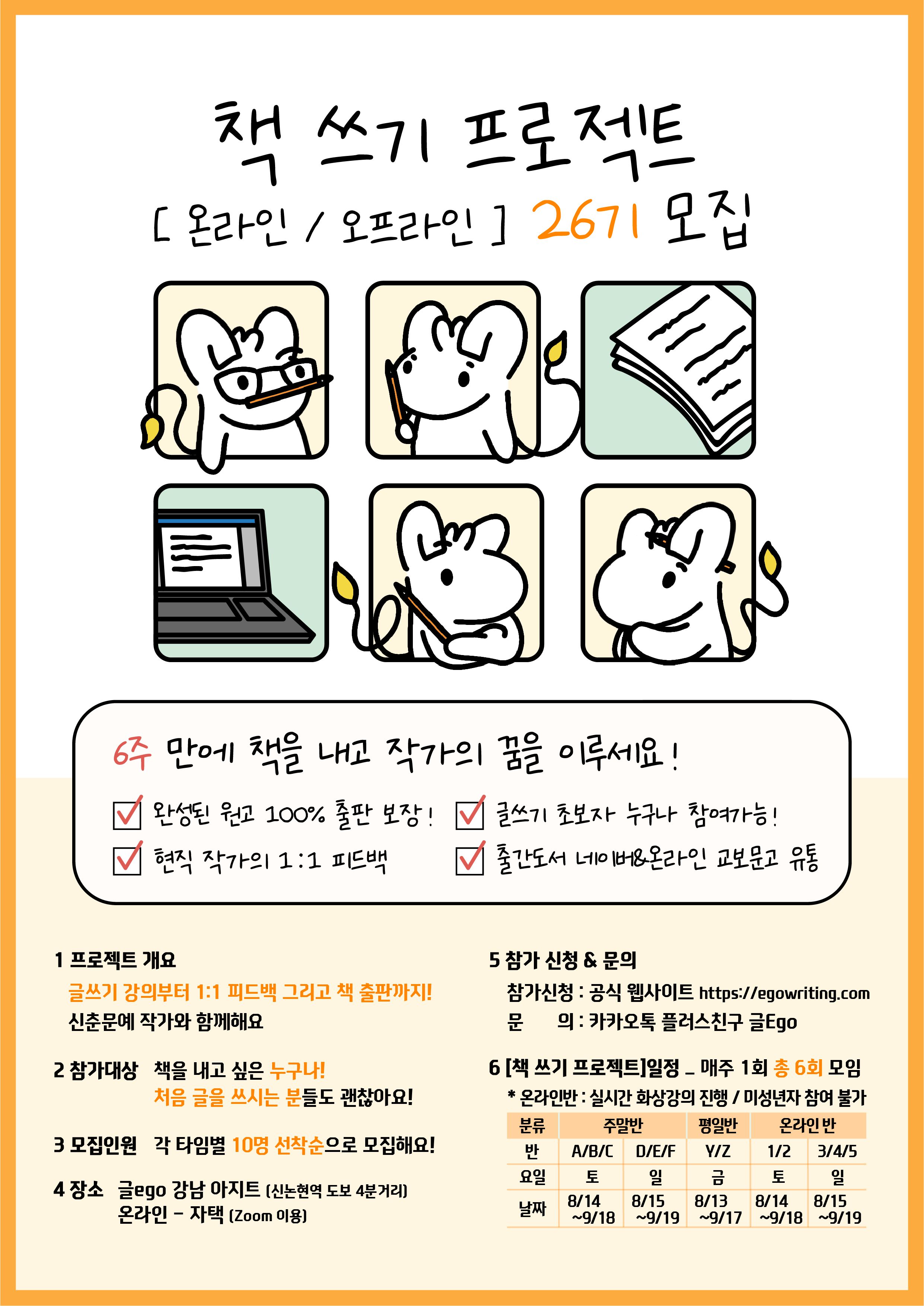 ※ 글을 처음 쓰는 사람에게 초점이 맞추어져 있는 프로젝트이기 때문에 등단을 목표로 하거나 글쓰기를 전공하시는 분에게는 추천드리지 않습니다.