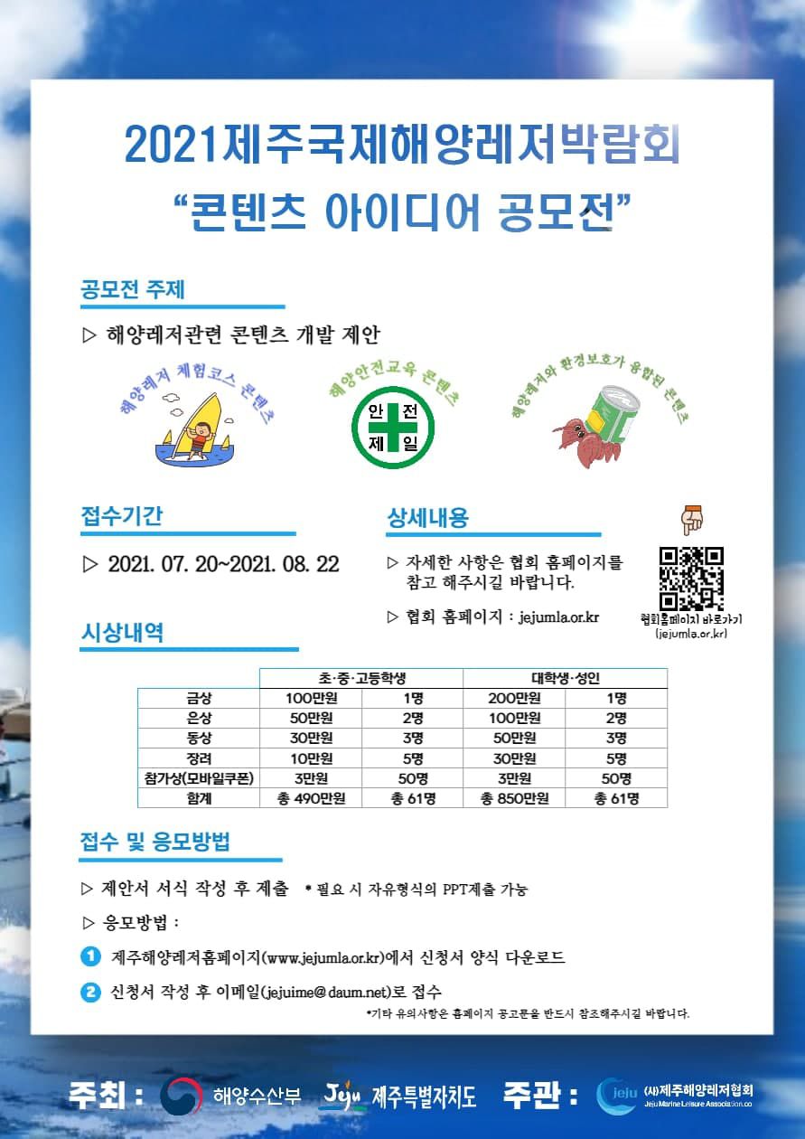 - 출품된 아이디어의 소유권은 제주해양레저협회에 귀속되며, 향후 활용, 홍보, 배포 등의 목적으로 무상으로 사용할 수 있음.