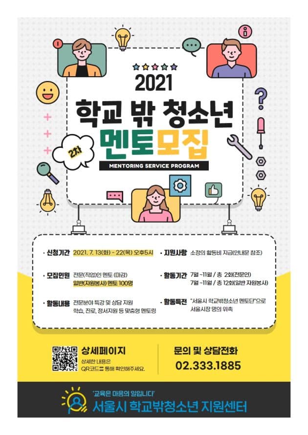 본 센터는 서울시와 함께 학교 밖 청소년을 위한 다양한 분야의 전문가 및 자원봉사자 멘토링 서비스를 제공하고자 합니다. 이에 청소년들이 건강한 시민으로 성장할 수 있도록 지원해 줄 ‘멘토’를 모집하오니 많은 참여 부탁드립니다.