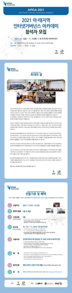 '2021년 아태지역 인터넷거버넌스 아카데미(APIGA2021)'를 온라인으로 개최합니다.