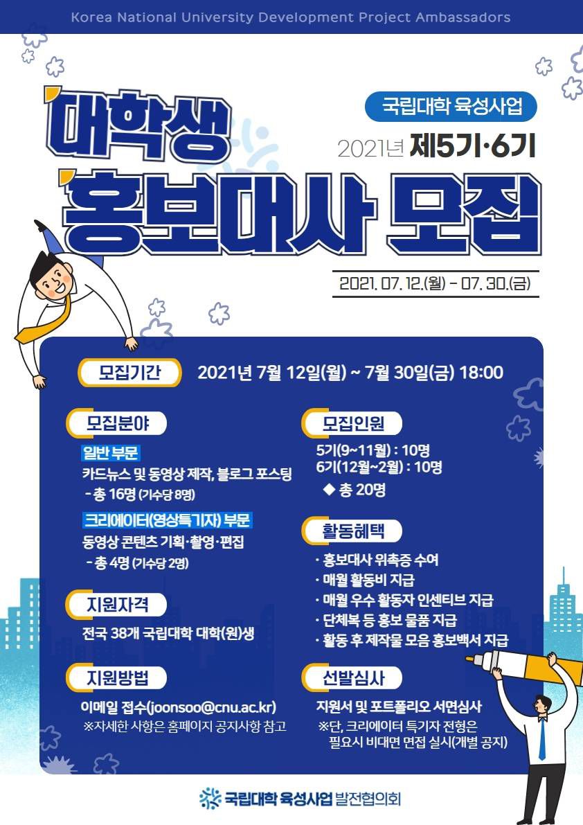 국립대학의 발전과 국립대학 육성사업을 함께 홍보할 대학생 홍보대사를 다음과 같이 모집합니다.