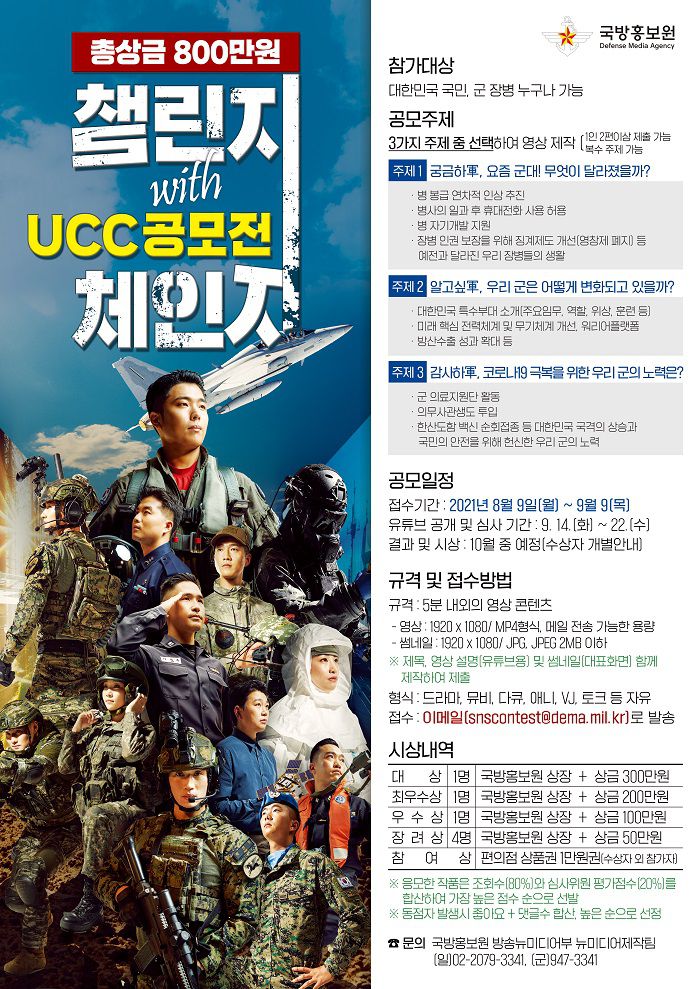 국방홍보원은 제73주년 국군의 날 기념, 우리 軍의 발전 ‘챌린지 with 체인지’ UCC 공모전을 아래와 같이 개최하오니 많은 참여 바랍니다.