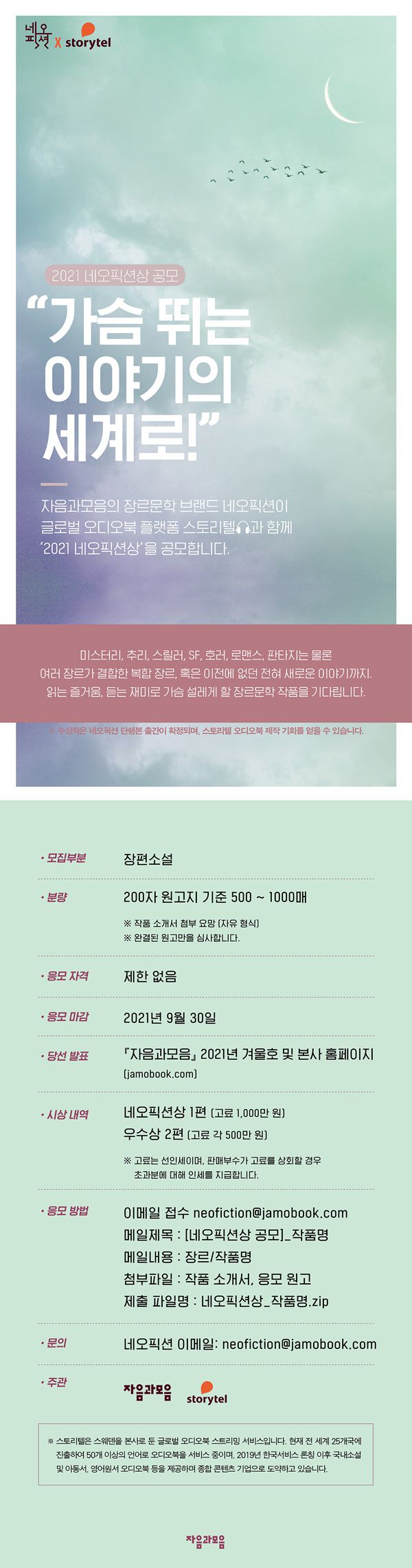 자음과모음의 장르문학 브랜드 네오픽션이 오디오북 플랫폼 스토리텔과 함께 ‘2021 네오픽션상’을 공모합니다.