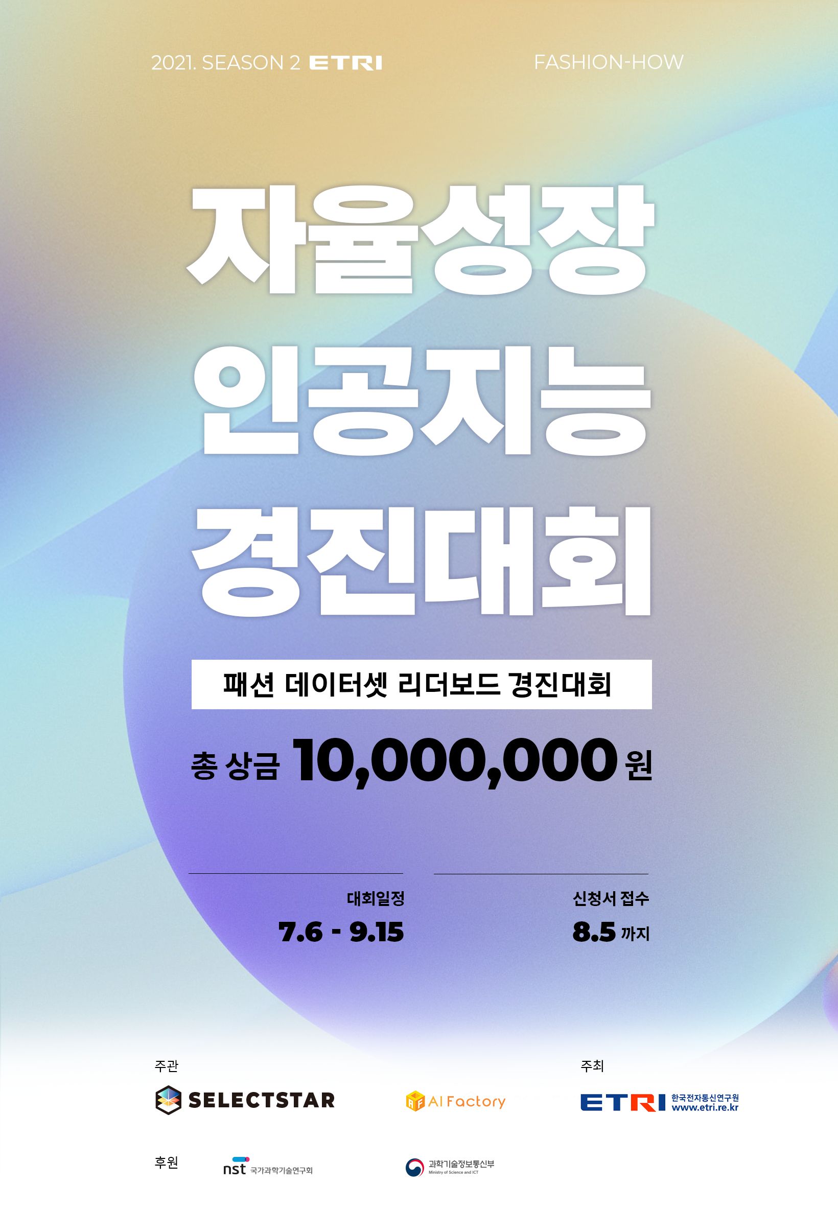 한국전자통신연구원(ETRI)이 주최하고, 셀렉트스타와 AI팩토리가 주관하는 AI 패션 코디네이터 리더보드 챌린지 <2021 ETRI 자율성장 인공지능 경진대회>가 개최됩니다!