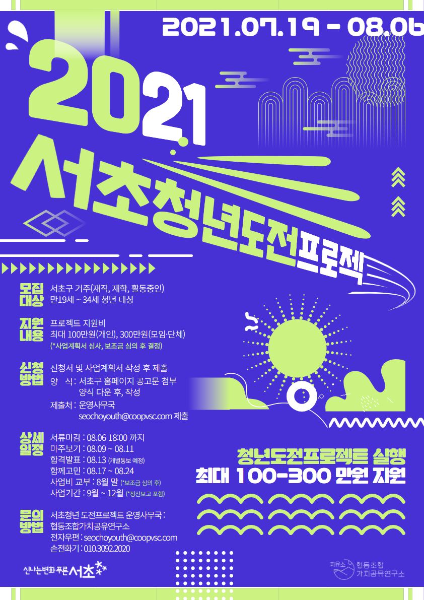 - 접수방법: [2021 서초청년 도전프로젝트 운영사무국] seochoyouth@coopvsc.com로 지원서를 보냅니다.