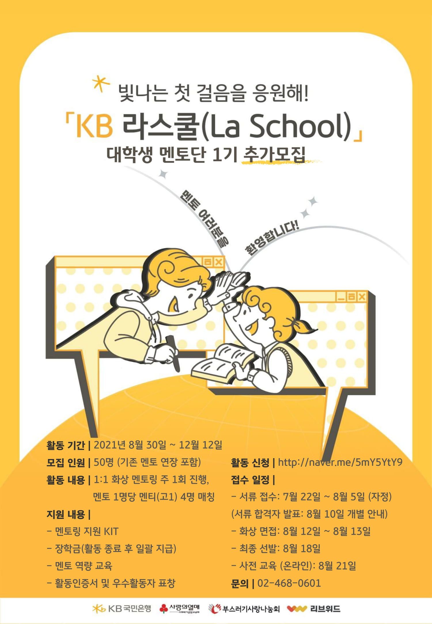코로나 19 상황에 더욱 취약한 청소년들에게 양질의 교육을 제공하고자 하는 KB 라스쿨은 올해 1월 첫 활동을 시작했습니다. 현재 KB 라스쿨 멘토들은 ZOOM을 통해 고등학교 1학년 멘티들에게 학습, 진로, 정서 등 ‘삶 통합 멘토링’을 제공하고 있습니다. 실시간 강의 및 온라인 멘토링에 대한 참여 아동들의 만족도가 높아 기존 예정된 운영 기간에서 연장해 운영하고자 합니다. 연장 운영 기간동안 멘토로 활동하실 분을 추가 모집합니다. 많은 지원 바랍니다!
