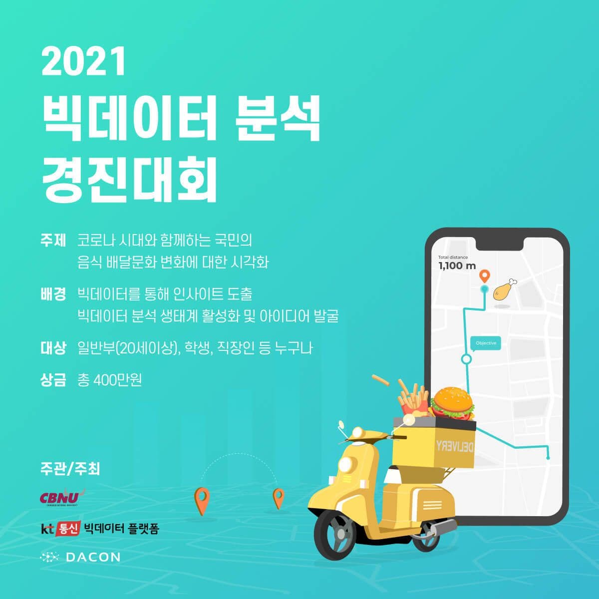 본 대회는 통신 분야 플랫폼으로 선정된 KT와 충북대 주최로 통신 빅데이터 플랫폼(https://www.bigdata-telecom.kr) 내 데이터를 활용하여 포스트 코로나 시대 유의미한 인사이트 도출과 빅데이터 기반의 생태계 활성화를 목적으로 합니다.