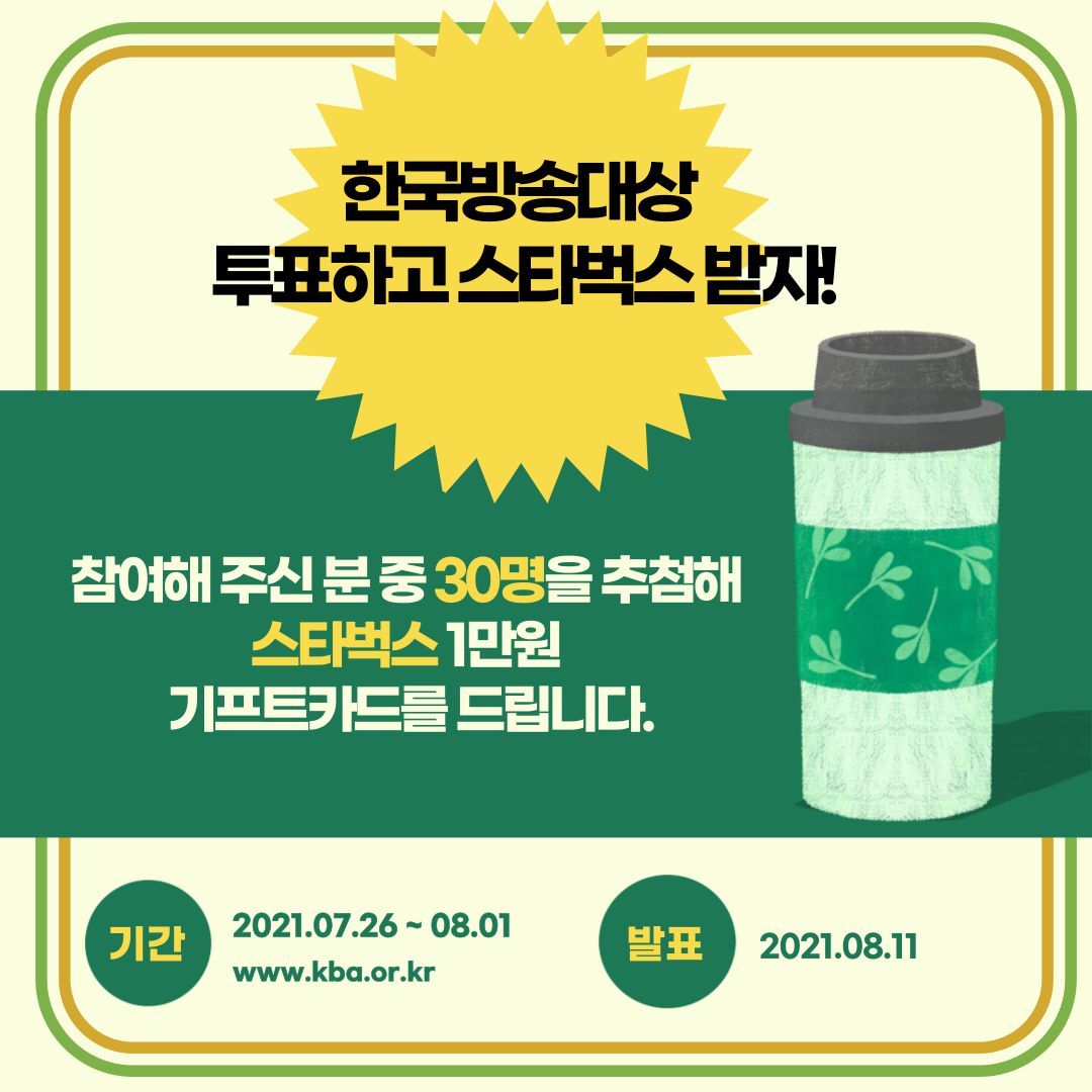 한국방송대상 작품상에 투표점수가 반영되니, 작품도 선정하고 추첨을 통해 스타벅스 쿠폰도 드리니 많은 참여 바랍니다.