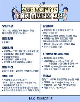 본회는 계리사 및 계리업계에 관심이 있는 대학(원)생 및 청년층을 대상으로 ‘IAK 제1기 서포터즈’를 운영하고자 합니다. 이에 관련 콘텐츠를 제작, SNS 등을 활용한 온라인 홍보를 진행할 수 있는 역량 있는 인재를 모집하고자 하오니, 많은 관심과 지원 바랍니다.