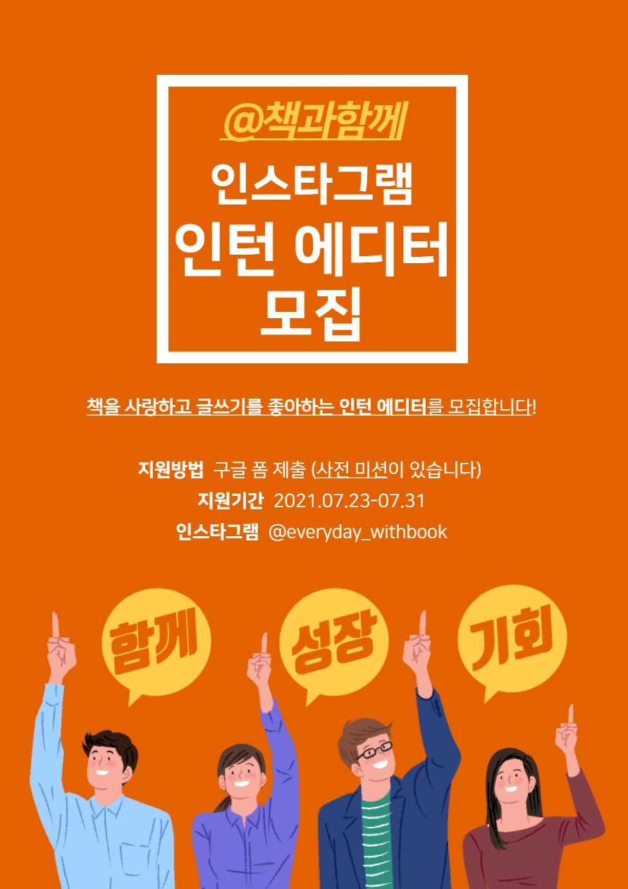 책을 좋아하는 사람들이 모여 만든 북크리에이터 그룹 <책과함께>의 인스타그램 인턴 에디터를 모집합니다.