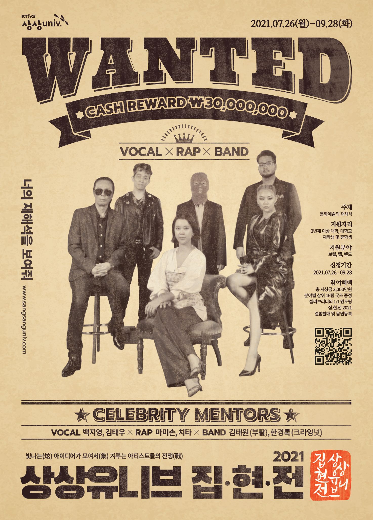 집·현·전 2021은 대학생 아티스트들의 꿈을 실현해 주고자 시작된 KT&G 상상univ.만의 차별화된 문화예술 프로그램으로, 수퍼멘토들이 들려주는 진정성 있는 멘토링과 참가자들의 컴피티션 등으로 구성되어 있습니다.