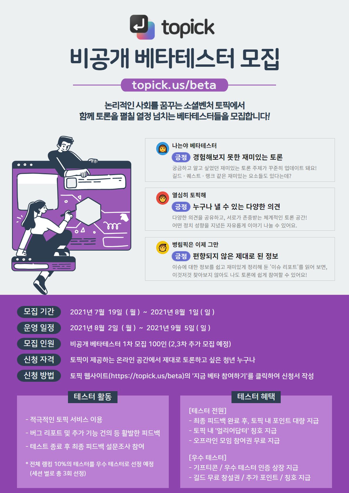 토픽팀에서 정식 서비스 오픈 전, 함께 토론할 비공개 베타테스터를 모집합니다🤗