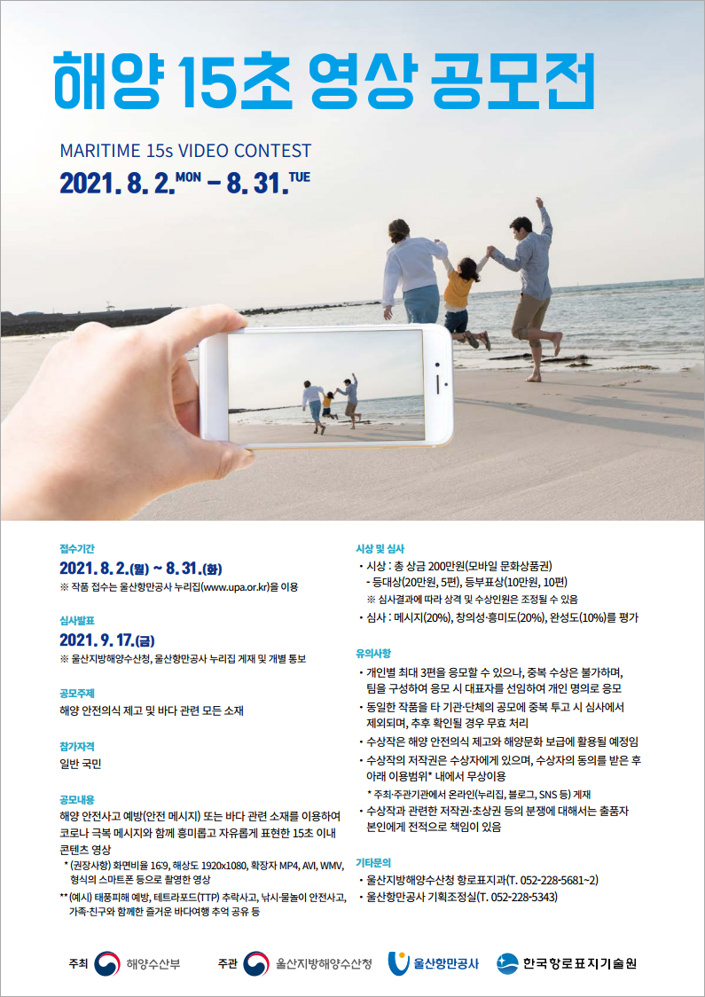 해양 관련 안전의식을 제고하고, 코로나 위기상황의 극복을 향한 응원 메시지 공유와 해양문화 저변 확대를 위한 「해양 15초 영상 공모전」을 아래와 같이 개최하오니 많은 참여바랍니다.