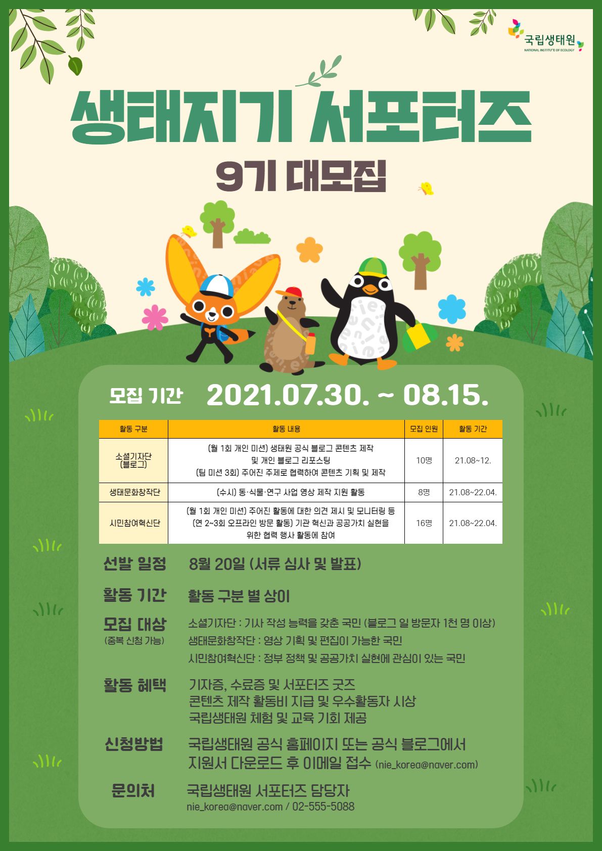 환경부 산하 국립생태원은 국립생태원과 생태·환경에 관심이 많으며 적극적인 사회변화를 위해 동참하고자 하는 국민을 대상으로 ‘NIE서포터즈 생태지기 9기’를 공개 모집합니다.