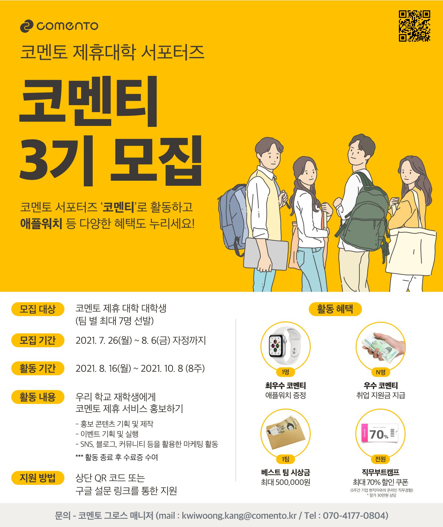 코멘토의 제휴대학 혜택을 널리 알릴 '코멘티' 3기 대학생 서포터즈를 모집합니다. 코멘티란 'co-mentee' 라는 말 그대로, 함께하는 멘티 여러분들을 뜻해요. 코멘토의 이야기를 더 많은 사람들에게 나누어주는 분들의 이름입니다.